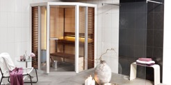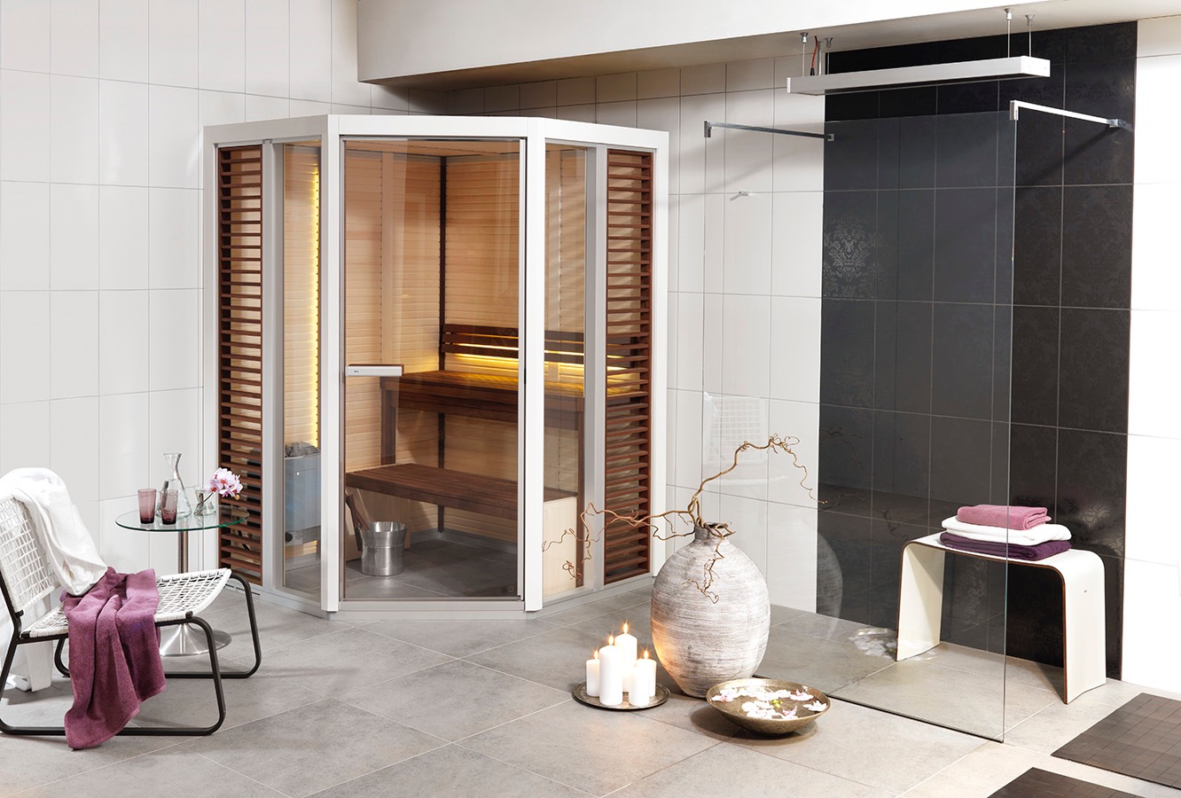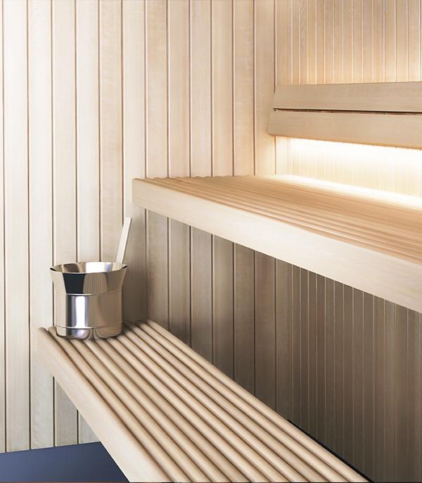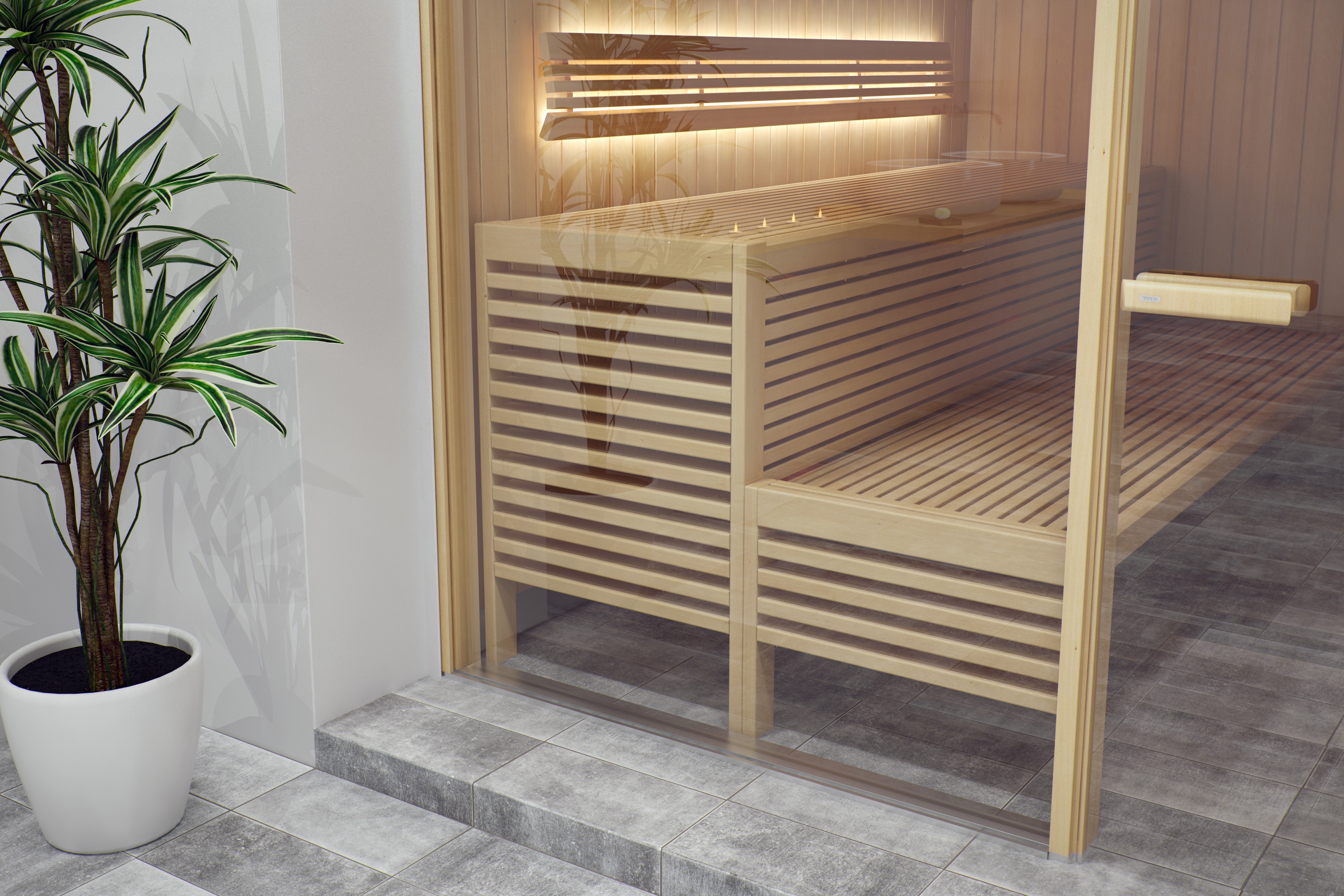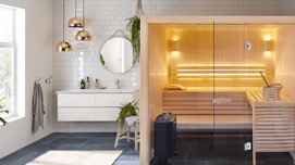 The stylish Harmony Log Premium interior is combined with glass doors and windows and gives an airy, timeless and handsome design which is available in many layouts. The flexible construction is highly adaptable to fit any bathroom and can even be installed under a pitched roof or in a corner. Add a number of convenient features such as towel and bathrobe racks or LED-type spotlights. The near knot-free solid spruce or fir keeps the sauna climate at an ideal level without any additional insulation.