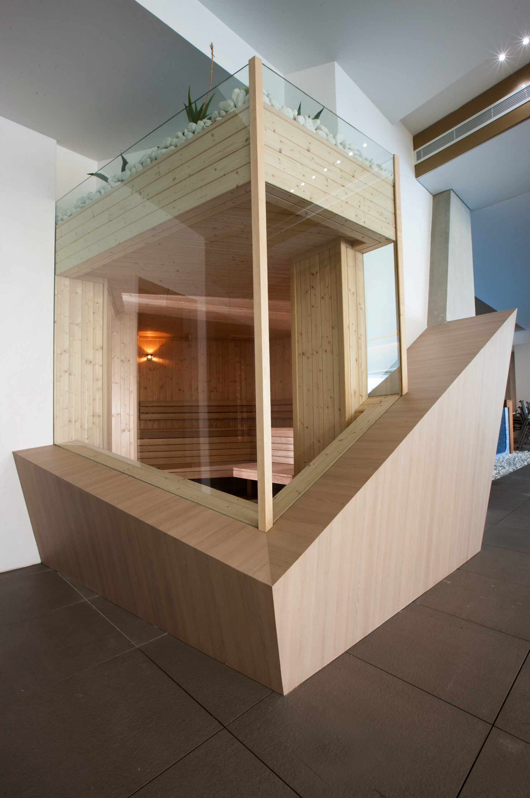 With its large glass sections, people while enjoying their sauna bath, have a nice overview of the whole spa.
