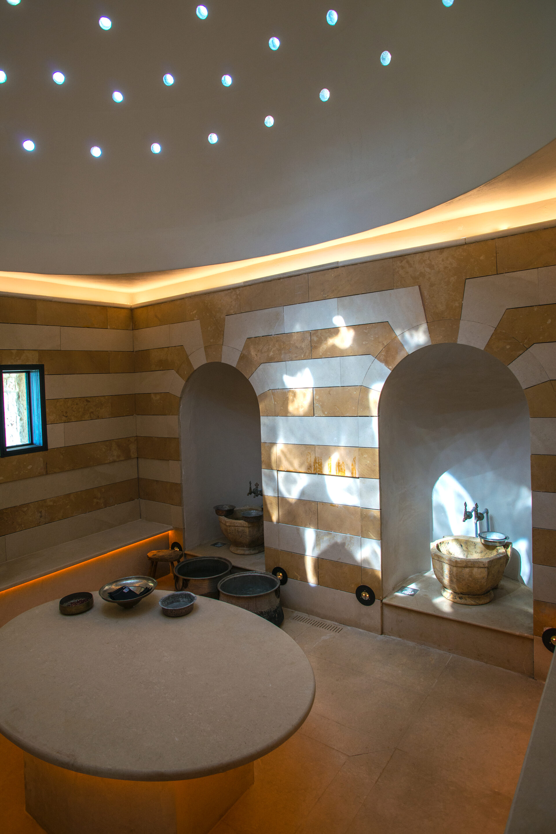 This sauna is installed in the SPA of an eco-friendly conversation project in the Shouf mountain named Bkerzay. It has a Glass in order to contemplate the illuminated dome above the cabin. There is also a window on the right side overlooking a beautiful landscape.
